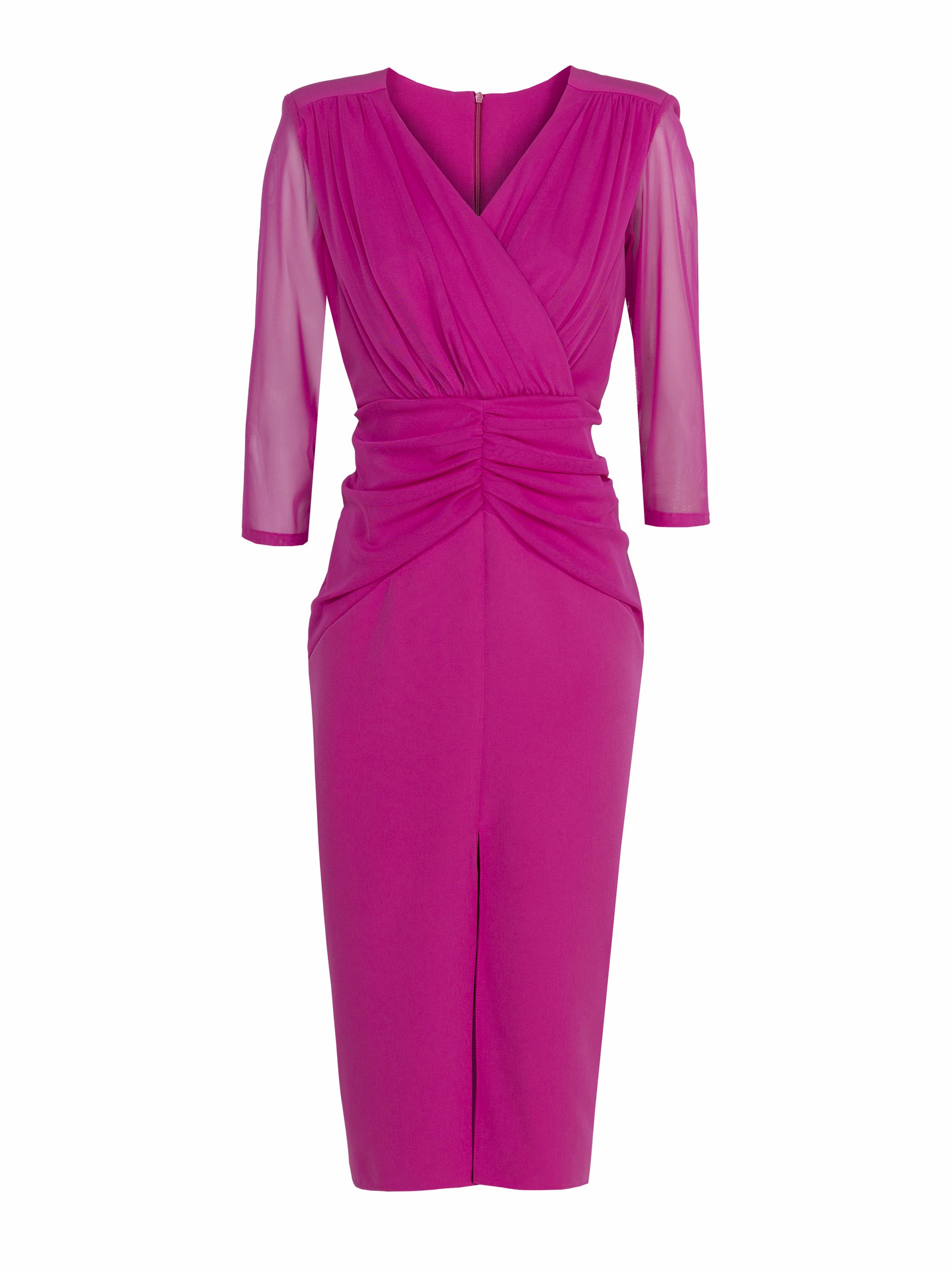 Vestido elegante y precioso confeccionado con chiflon, gasas y tule con fruncidos en un color rosa único. Muy ponible y favorecedor. Escote V mangas semitransparentes preciosos pliegues y falda tuvo con abertura.