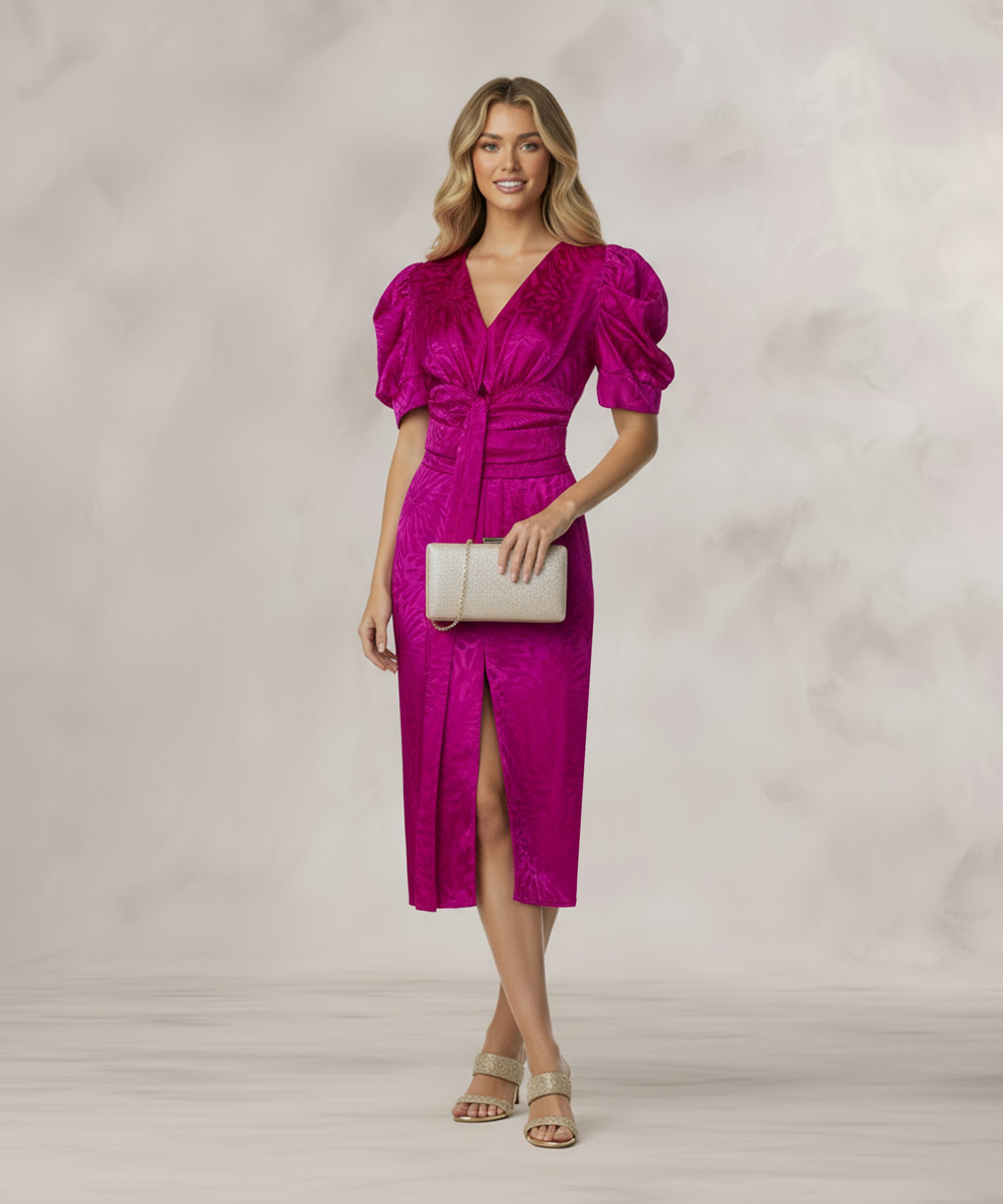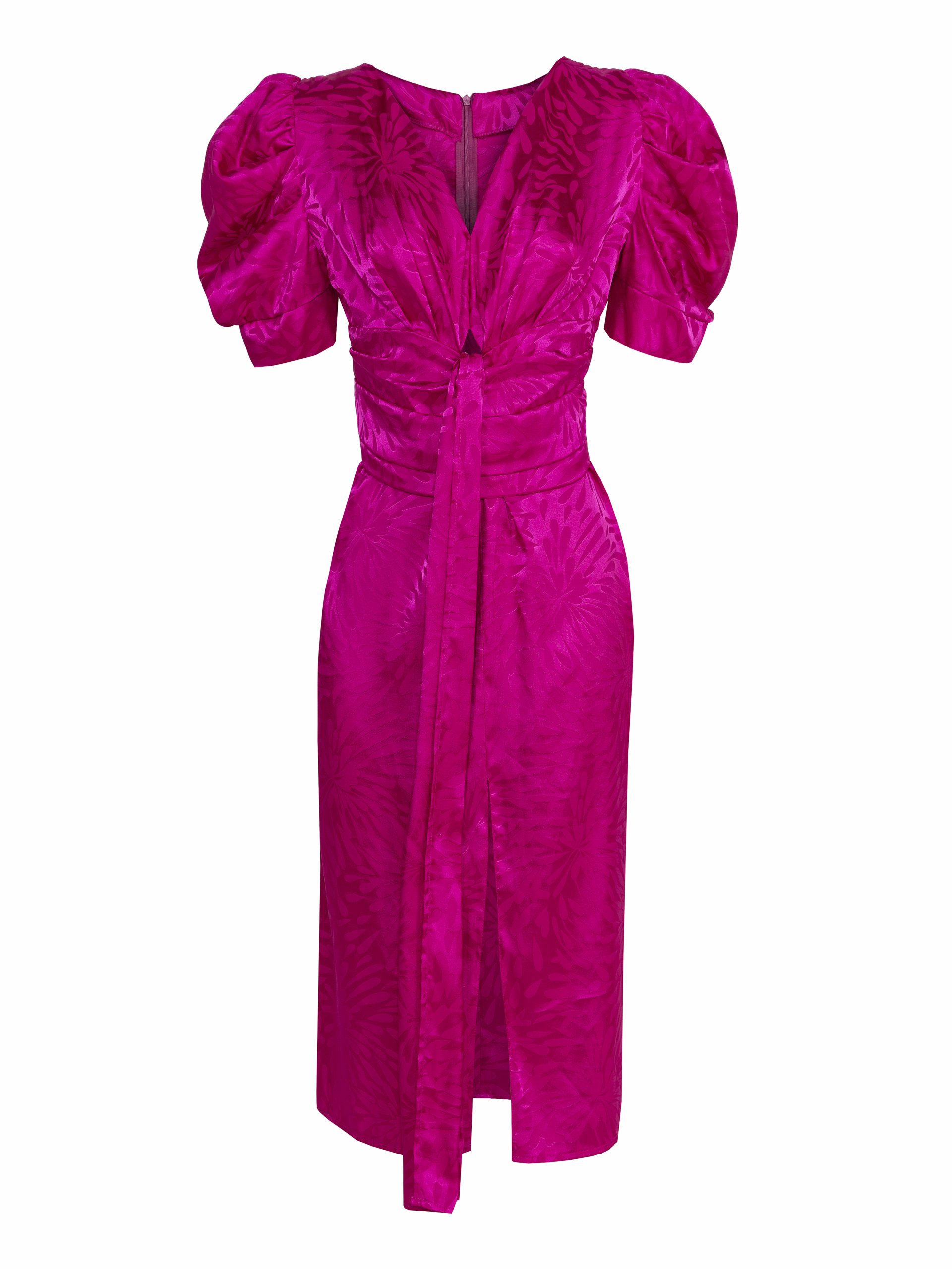 Vestido espectacular confeccionado en tela satén en tono rosa fucsia, manga globo, falda recta con abertura, elegante y versátil.